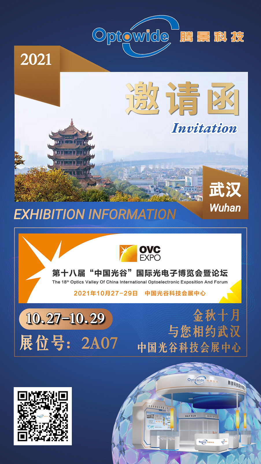 2021年第十八届“中国光谷”国际光电子博览会暨论坛(简称:武汉光博会),将于2021年10月27-29日在中国光谷科技会展中心举行,预计参展企业 360 家,展览面积 20,000 平方米,专业观众超 15,000人。